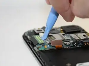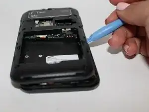 Используйте пластиковый инструмент для открытия, чтобы отсоединить два язычка, соединяющих материнскую плату с основанием телефона.
