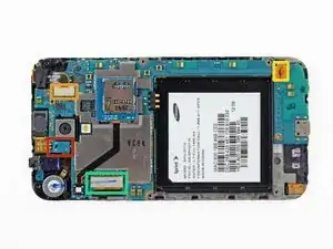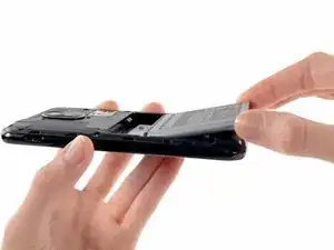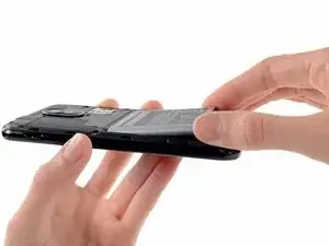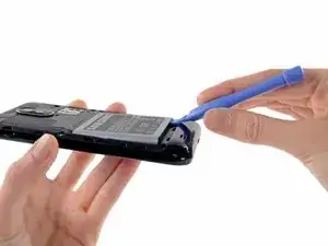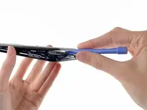 Зацепите пластиковый инструмент для вскрытия в щель между аккумулятором и средней рамкой, расположенную в нижнем левом углу.
