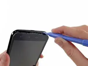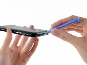 Вставьте пластиковый инструмент немного левее порта micro-USB и подденьте между средней рамкой и дисплеем, чтобы открыть зазор.