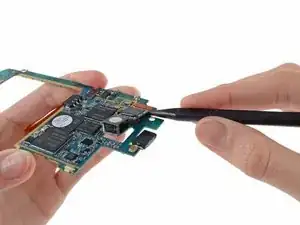 Поднимите конец материнской платы с разъемом micro-USB от сборки дисплея и потяните её вниз.