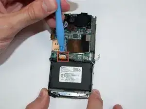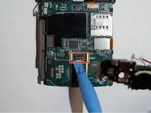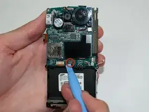 Немного переверните материнскую плату, чтобы получить доступ к её задней части, затем используйте инструмент для вскрытия, чтобы отщёлкнуть и отсоединить оставшийся шлейф.