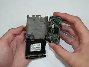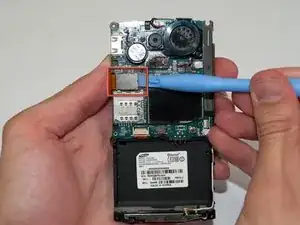 С помощью инструмента для вскрытия iPod отсоедините красный и чёрный провода, соединяющие динамик с материнской платой.