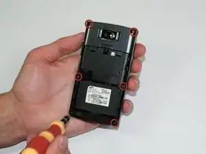 Используйте крестовую отвертку Phillips #00, чтобы выкрутить шесть винтов на задней панели телефона. По три равномерно расположены с каждой стороны.