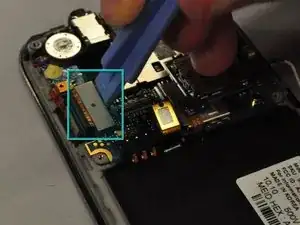 Используя пластиковую вскрывающую инструмент, отсоедините чёрный квадратный элемент, выделенный синим цветом.