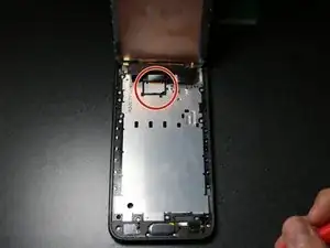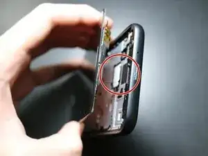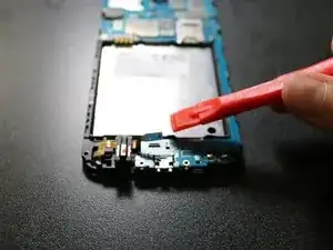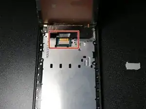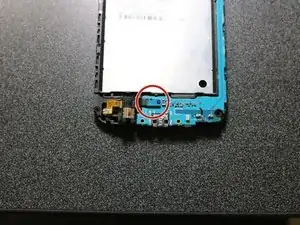 Найдите синий ленточный кабель, подключённый непосредственно под гнездом аккумулятора. Это разъем для аудиоразъёма.