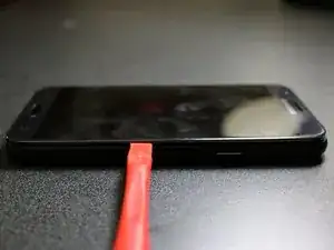 Пока клей экрана еще теплый и гибкий, вставьте инструмент для поддевания или пластиковую карту между стеклом дисплея и рамкой телефона.