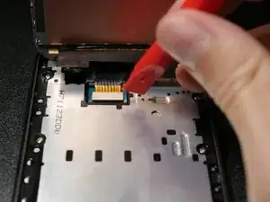 Используйте инструмент для поддевания, чтобы медленно приподнять правый нижний угол белого крепления кабеля, оголив тонкий разъем ленточного кабеля.