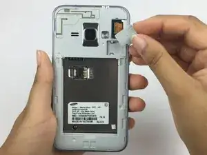 Используйте пластиковой лопаткой или ногтем подденьте заднюю крышку, поддев углубление слева от камеры.
