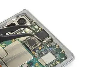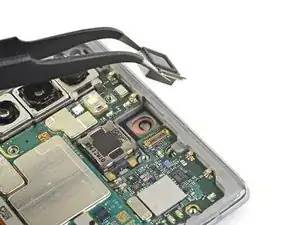 Воспользуйтесь острым концом лопатки, чтобы отсоединить разъём фронтальной камеры, поддев его вверх строго перпендикулярно материнской плате.