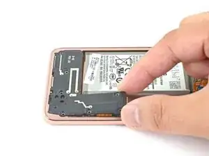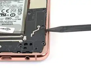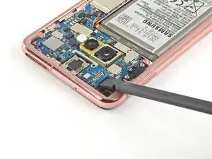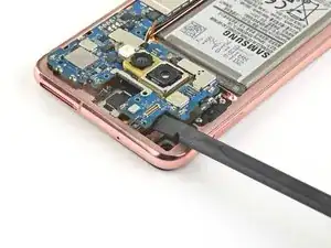 Вставьте острый конец лопатки в небольшой вырез на правом краю пластиковой части верхней средней рамки, рядом с кнопкой Bixby.