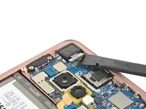 Используйте лопатку, чтобы приподнять и отключить разъём фронтальной камеры от её гнезда на плате.