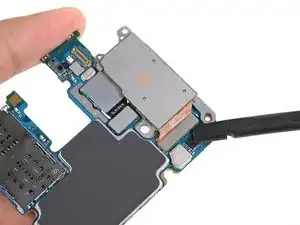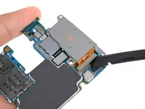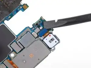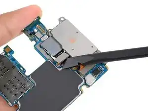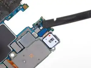 Вставьте плоский конец лопатки в нижний левый угол узла материнской платы и подденьте, чтобы освободить его от корпуса телефона.