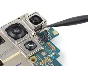 Используйте лопатку, чтобы отсоединить гибкий кабель телеобъектива на задней стороне материнской платы, поддев его разъём прямо вверх от гнезда.