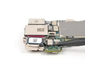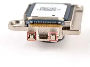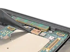 Повторите эту операцию, чтобы отключить пресс‑коннекторы кабелей дисплея и 5G mmWave, расположенные на нижнем левом краю материнской платы.