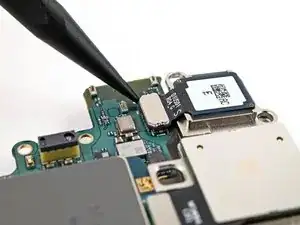 Используйте лопатку, чтобы поддеть и отсоединить прижимной разъём катушки беспроводной зарядки press connector от материнской платы.