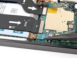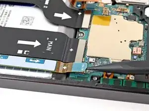Используйте лопатку, чтобы поддеть и отсоединить прижимные разъёмы кабеля дисплея и нижней антенны от материнской платы.