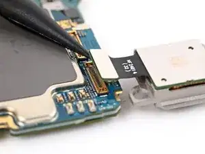 Подденьте и отсоедините прижимной разъём фронтальной камеры от материнской платы.