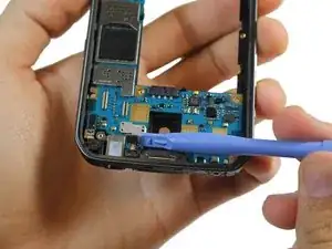 Используйте пластиковый инструмент для вскрытия, чтобы отсоединить синий провод, показанный на изображении.