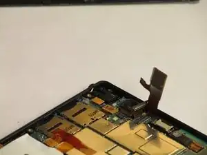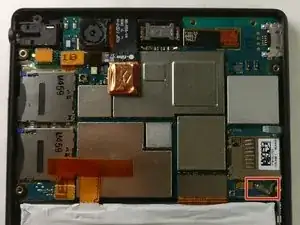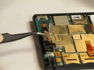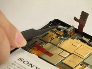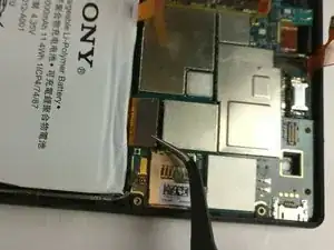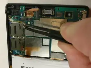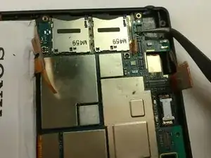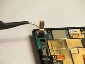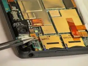 Используя пинцет, аккуратно отсоедините микросхему фронтальной камеры, как показано на изображении. Затем с помощью пинцета аккуратно извлеките компонент фронтальной камеры.