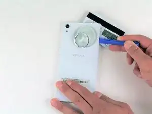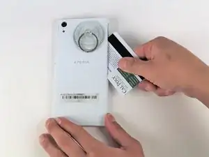 Поднимите инструмент iFixit и вставьте вашу пластиковую карту в небольшой зазор между телефоном и задней крышкой.