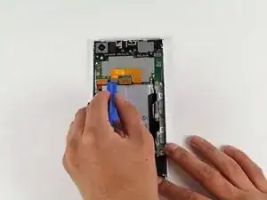 Используйте инструмент iFixit, чтобы удалить гибкий шлейф кнопки питания (левая оранжевая вкладка) с материнской платы.