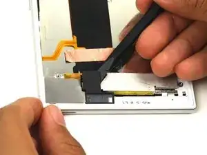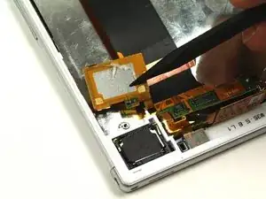 Держась за Sony Xperia Z ultra левой рукой, слегка потяните маленькую присоску вверх, чтобы создать небольшое отверстие между задней и фронтальной панелями.