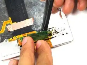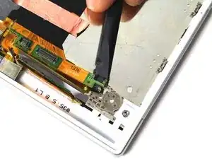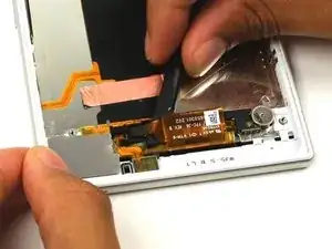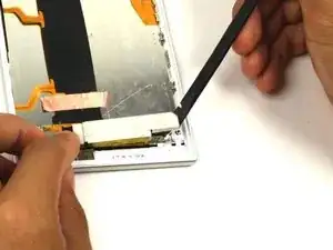 Используйте плоскую часть лопатки, чтобы отсоединить соединение вибромотора. Это небольшой белый разъём с красным и чёрным проводами, идущими к мотору.