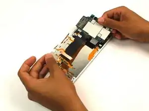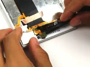 Отделите меньший оранжевый шлейф, поддев лопатковым инструментом между корпусом телефона и шлейфом. Это поможет предотвратить повреждение полосы.