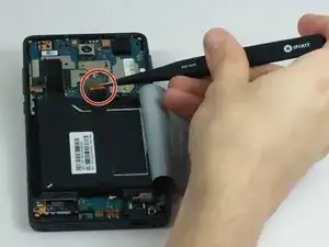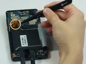 Найдите другой кабель, соединяющий материнскую плату с устройством в верхней правой части телефона, и осторожно также снимите его пинцетом.