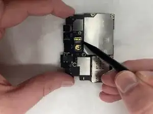 С помощью лопатки аккуратно откиньте металлическую защёлку, удерживающую камеру, расположенную на обратной стороне материнской платы.
