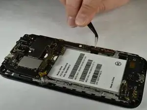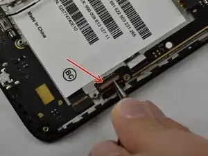 С помощью изогнутых пинцетов аккуратно снимите чёрный кабель, идущий по левой стороне устройства, и отсоедините его от разъёма.