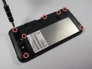 Удалите семь винтов Philips 3.175 мм из внутренней задней крышки, расположенных в верхней, верхне-средней, средней, нижне-правой и нижней частях.