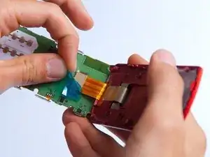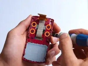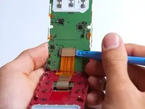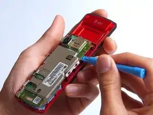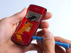 Отделите красную заднюю часть слайдера от передней крышки, вставив пластиковый инструмент между двумя секциями и обойдя весь телефон по периметру.