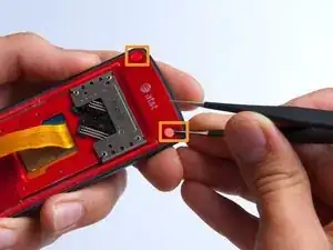 Снимите две заглушки винтов в верхней части телефона пинцетом.