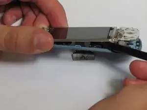 С помощью пластикового инструмента приподнимите плату с противоположной от динамика стороны. Это откроет доступ к механизму слайдера, расположенному под экраном.