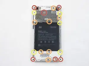 После снятия задней панели вам нужно будет отсоединить рамки, которые удерживают аккумулятор. Найдите и удалите винты (винты обозначены на изображении). После удаления винтов вы сможете легко снять рамку.