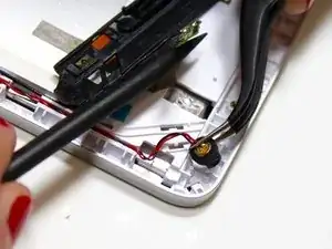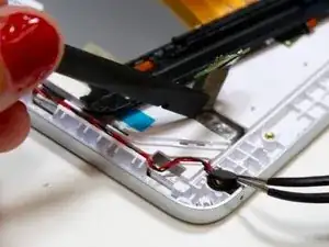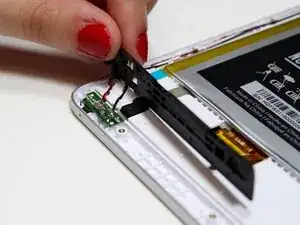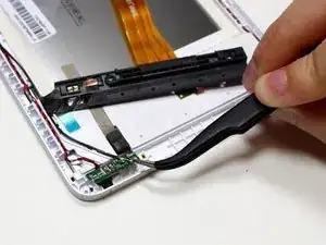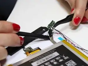 Снимите металлическую защёлку, которая соединяет ленточный кабель аккумулятора с платой, поддев её вверх. Для этой операции лучше всего подходят точные пинцеты.