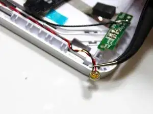 Микроплата прикреплена к серебристой клейкой полосе. Вам потребуется аккуратно отслоить эту полосу, чтобы микроплата сместилась достаточно, чтобы добраться до микрофона.