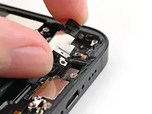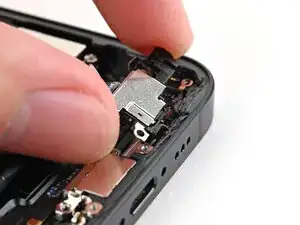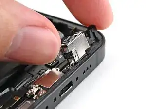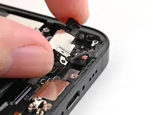 Используйте пинцет или пальцы, чтобы приподнять нижнюю крышку разъёма и сдвинуть её к верхней части телефона, чтобы освободить от металлической защёлки.
