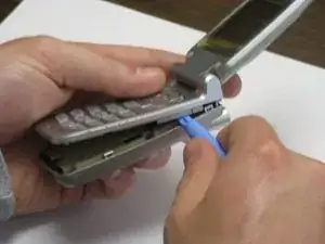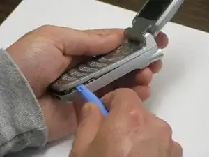 Перевернув телефон, подденьте заднюю крышку от лицевой панели, проводя наконечником пластикового инструмента для вскрытия по шву на задней части телефона.