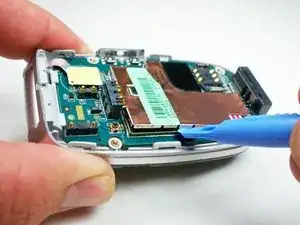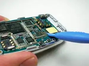 Поднимите жёлтую перемычку с помощью пластиковой лопатки, чтобы отключить материнскую плату от корпуса телефона.