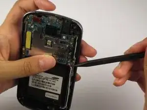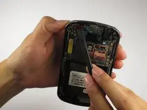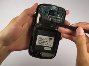 Снимите белый кабель вдоль правой стороны устройства (рядом с отсеком аккумулятора), используя нейлоновую лопатку.
