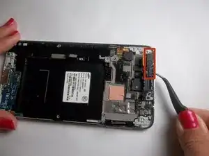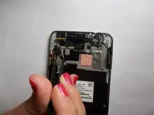 Вставьте ноготь или пластиковый инструмент для открытия в маленький зазор между аккумулятором и основанием телефона.