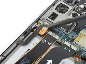 Осторожно приподнимите и отогните гибкие кабели дисплея и левой 5G mmWave антенны, чтобы освободить место вокруг материнской платы и батареи.