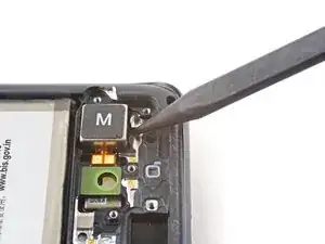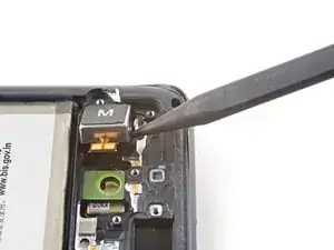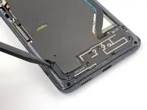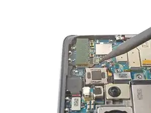Вставьте наконечник лопатки в нижний левый угол сборки материнской платы и подденьте вверх, чтобы освободить её от корпуса телефона.