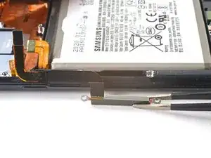 Подденьте и отсоедините кабель верхней 5G mmWave антенны от материнской платы.