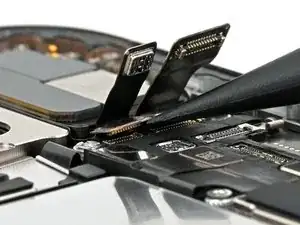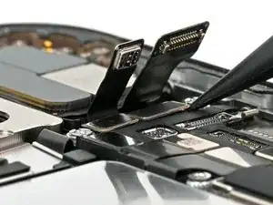Используйте пальцы или лопатку, чтобы сдвинуть гибкие шлейфы передней камеры вверх к слуховому динамику, затем уложите их в зазор между слуховым динамиком и платой.