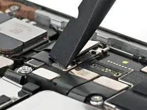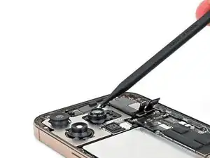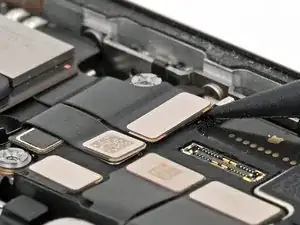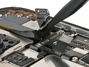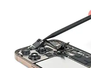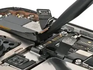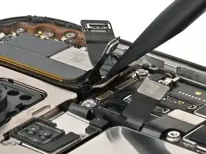 Используйте острый наконечник лопатки, чтобы приподнять и отключить нажимные разъёмы динамика слухового отверстия и антенны 5G mmWave, расположенные в правом верхнем углу платы.