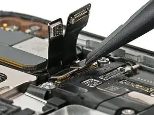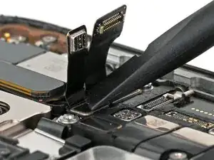 Используйте острый наконечник лопатки, чтобы приподнять и отключить два нажимных разъёма модуля передней камеры, расположенные под предыдущими двумя.