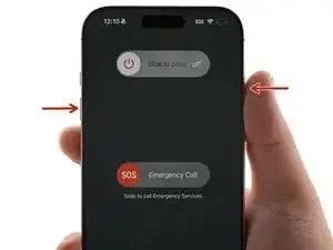 Удерживайте кнопку питания и любую из кнопок регулировки громкости, затем сдвиньте ползунок для выключения iPhone.